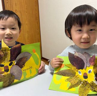「ガオー!」と言いながら貼る子、「フワフワ〜」と落ち葉の手触りを楽しむ子、それぞれの個性が爆発!